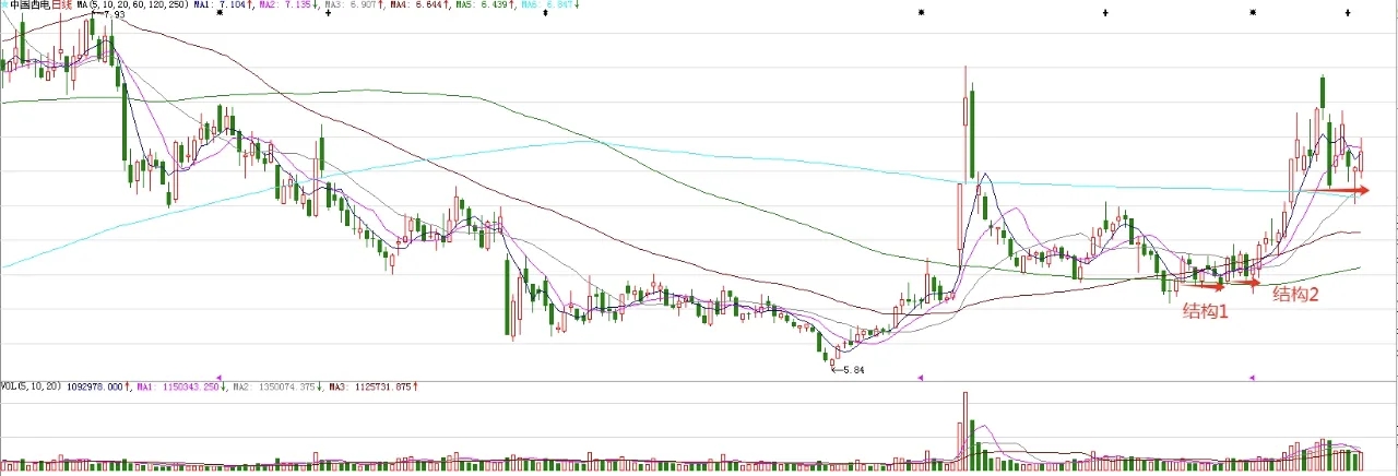 今天企稳回升,符合预期。今天涨幅不大,但是确认了昨天低点的有效性。短线或有反复,但是中期低点已经探明,接下来一段时间,股价整体上会向上运行。分析方法,写在三部书稿中。只要站上7.36,就实现结构3的有效突破,开启下个阶段的波段上涨。图中标注的前两个结构突破,意味着股价开启波段上涨。近期的震荡,主要是为了给半年线和六十单位均线更多时间上行。