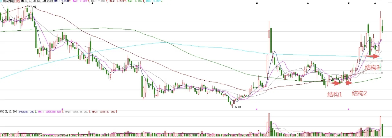 今天调整,短线来看,周三股价还有调整。周期面来看,今天是第三个有效周期,明天或者后天是变盘节点,所以,短线下探的空间不大。这是结构3突破后的回踩,是正常的调整,还是为了给半年线和六十日均线更多时间修复。图中标注的结构1和结构2突破,意味着波段上涨开始。结构3突破,意味着波段上涨不远了。短暂调整后,波段上涨大概率还会继续。