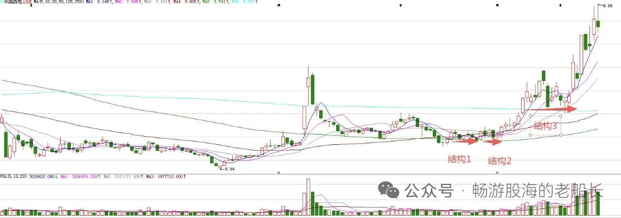 今天冲高回落,日K线震荡幅度比较大,释放了调整信号。周三股价大概率有调整。周期面来看,最近一段上涨,到今天为止,走了七个有效周期,还不到变盘节点,所以调整幅度不大,很短暂。图中标注的结构1和结构2突破,意味着股价进入到波段上涨阶段。结构3的突破,意味着新的波段上涨开始。目前,股价依然处在波段上涨中。