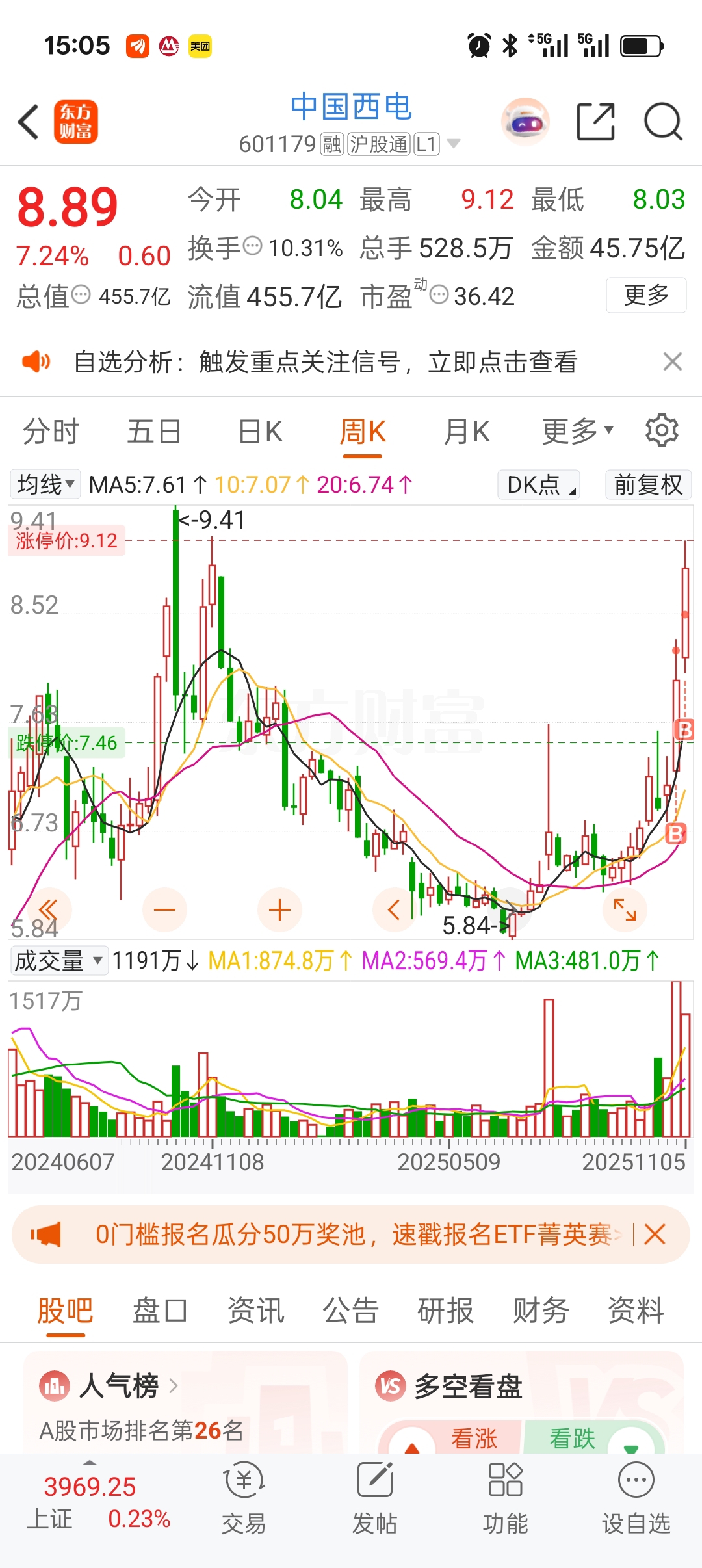 $中国西电(SH601179)$ 解放前高套牢盘!承接很强,后势看涨!