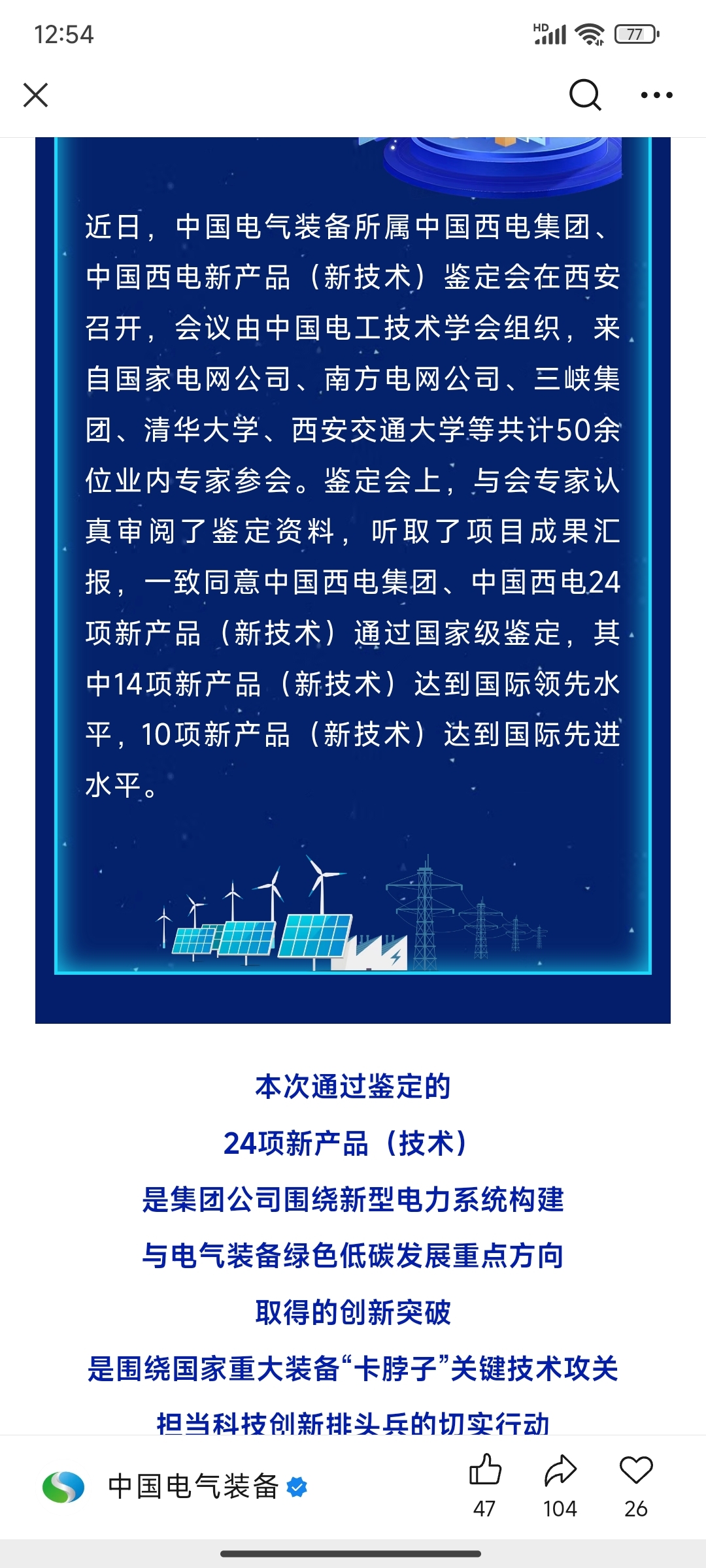 中国电气装备24项新产品(新技术)通过国家级技术鉴定!!!短期与股价涨跌可以有关