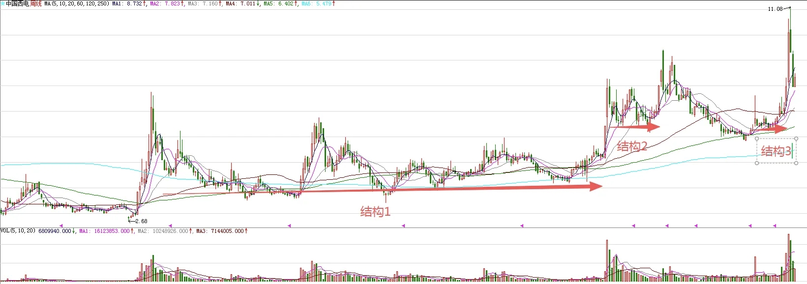周线级别的走势来看,连续调整了两周,调整幅度比较大,基本回踩十周均线。我们要知道调整的级别,本次调整,是有效上涨周期到了9引发的,调整目标就是十单位均线,所以调整空间到了,本周K线也释放了企稳信号。所以,调整大概率要结束了。图中标注的大型结构1和结构2突破,意味着股价处在比较大的上涨趋势。结构3突破,意味着波段上涨得到确认。接下来,股价大概率还会继续波段上涨。