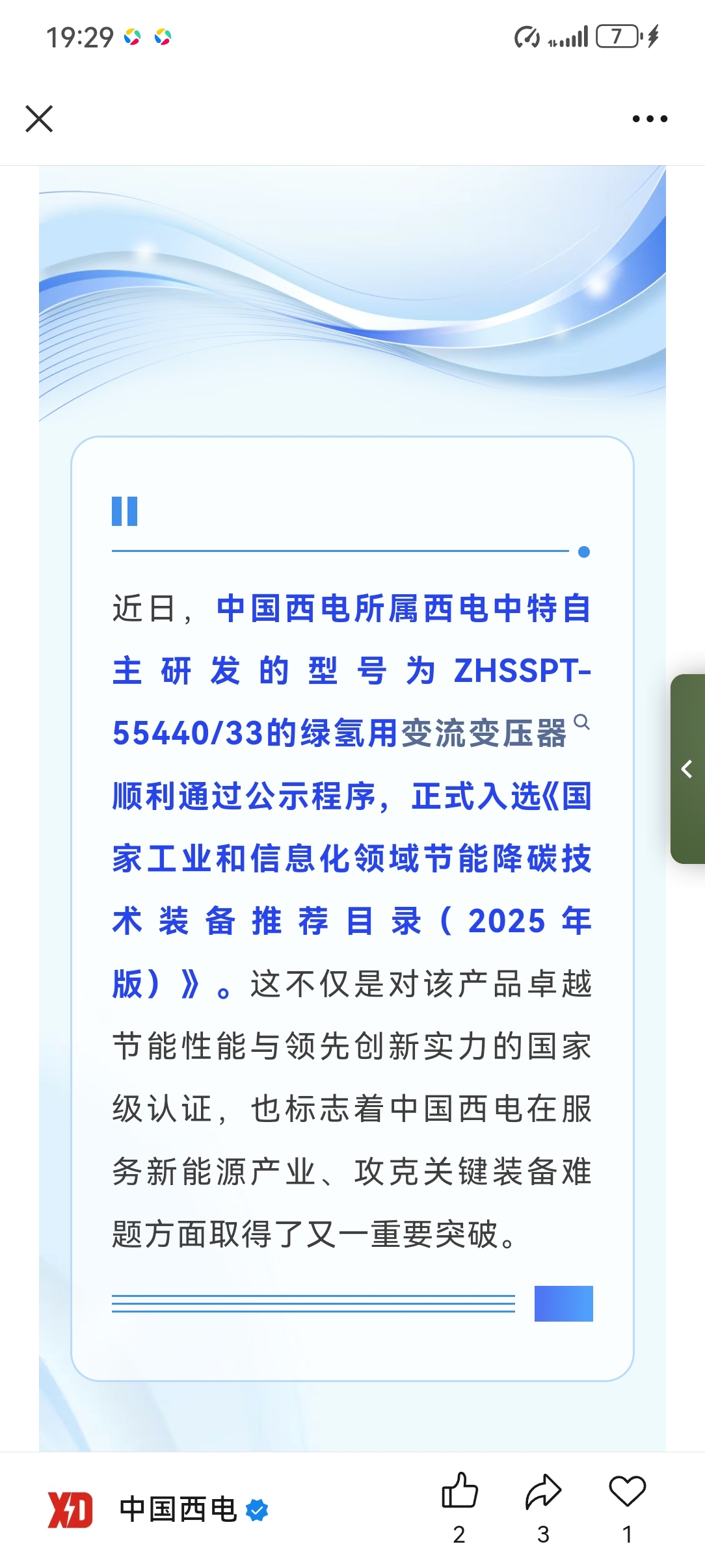 $中国西电(SH601179)$ 核心技术!中国西电所属西电中特绿氢变压器入选国家级节能目录