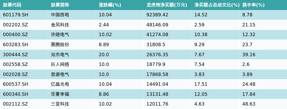 21智讯1月19日电,南财金融终端数据显示,因当日异动登上龙虎榜的个股中,资金净买入最多的前三位分别是中国西电(601179.SH)、金风科技(002202.SZ)与许继电气(000400.SZ)。其中排名第一的中国西电净买额达9.24亿元,占总成交金额的14.52%。中国西电当日收盘上涨10.04%,换手率为8.78%,净买入额前10个股详情见下图: