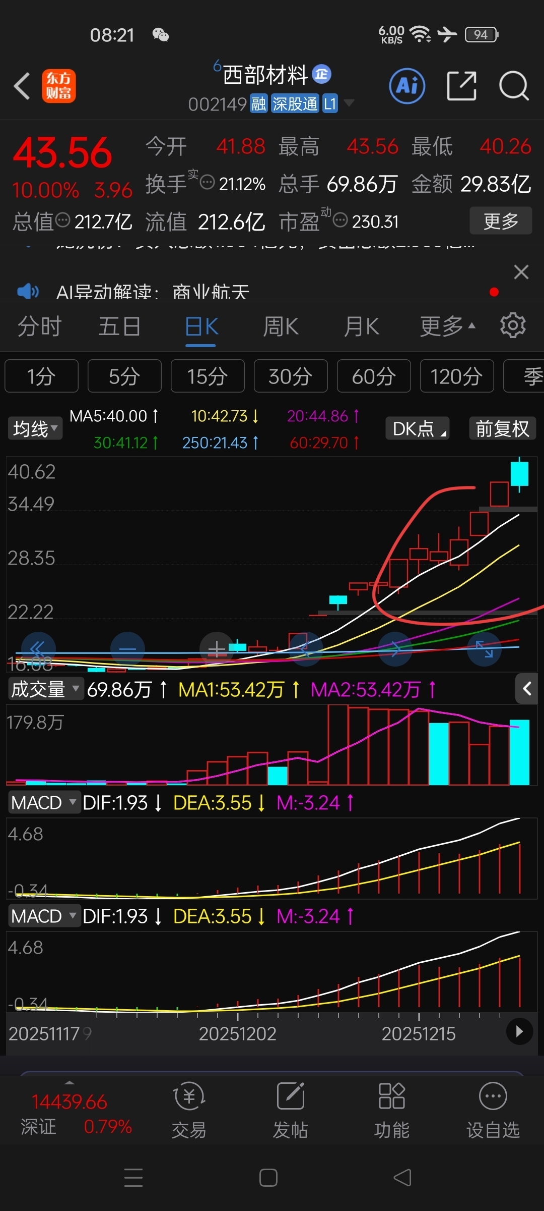 跟西部材料这里一样的走势,冲高三天释放获利盘,周一大阳线直接突破两个板,Ai的尽