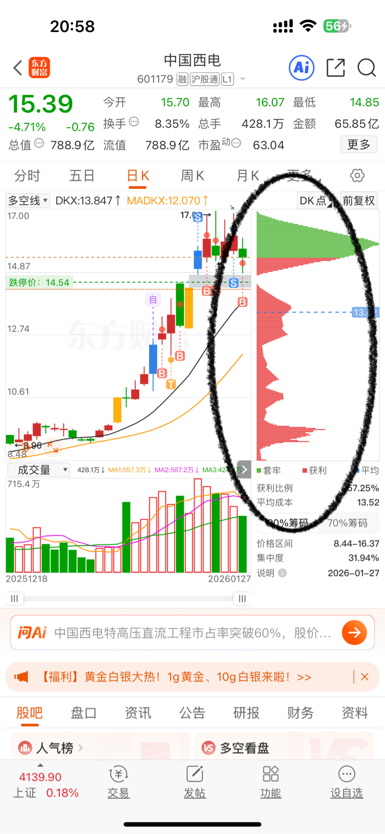 $中国西电(SH601179)$ 筹码峰显示,主力已经出货,套牢盘加重,短期有压力,长期看涨。