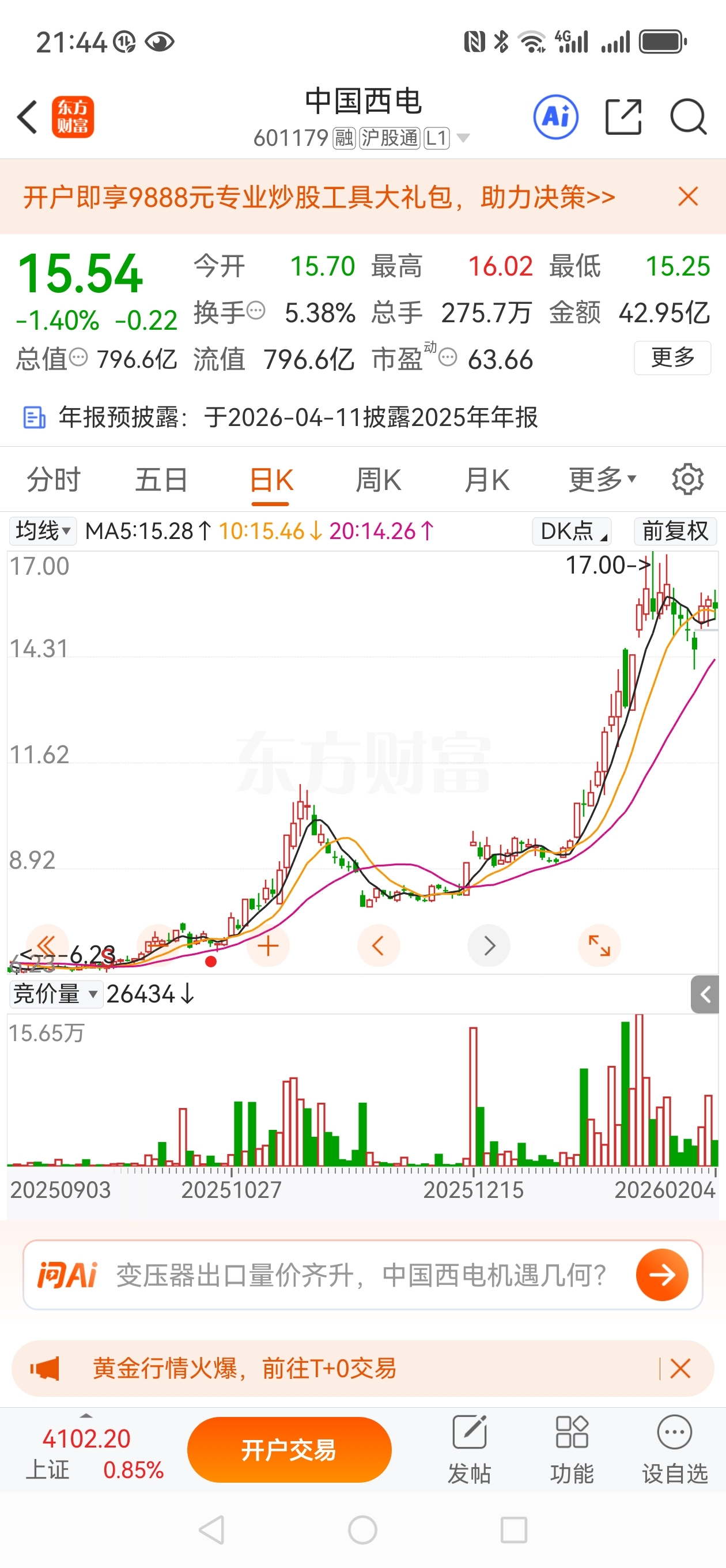 早盘15.70元开,最高冲至16.02元,最终收盘15.54元,下跌1.40%,单日振幅4.89%,股价运行区间集中在15.25-16.02元。全天成交量275.7万手,成交额42.95亿,换手率5.38%,量比0.75,资金活跃度较前一交易日有所下降;委比-28.50%,卖盘力量稍占优势,内盘成交148.0万手,外盘成交127.7万手。电气设备板块今日整体表现平稳,受大盘影响,个股冲高回落,虽尾盘有小幅反弹,但整体弱势格局未改。