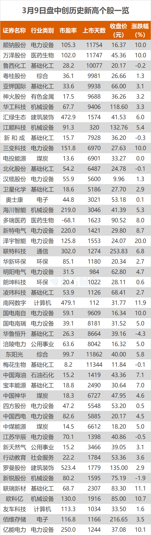 3月9日,A股三大指数今日宽幅震荡,截止收盘,沪指跌0.67%,收报4096.60点;深证成指跌0.74%,收报14067.50点;创业板指跌0.64%,收报3208.58点。东方财富Choice数据显示,今日有48只个股盘中股价创历史新高,分别为中国西电、中国海油等。
