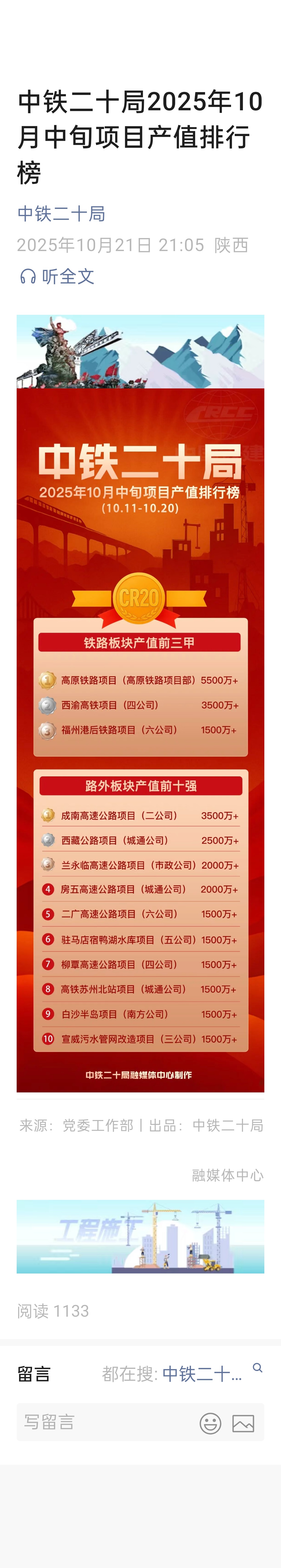 $中国铁建(SH601186)$ 中铁二十局各项目部产值排名