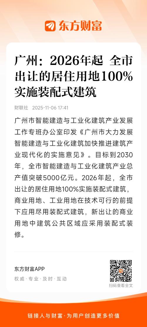 广州市智能建造与工业化建筑产业发展工作专班办公室印发《广州市大力发展智能建造与工业化建筑加快推进建筑产业现代化的实施意见》。目标到2030年,全市智能建造与工业化建筑产业总产值突破5000亿元。2026年起,全市出让的居住用地100%实施装配式建筑,商业用地、工业用地在技术可行的前提下应用尽用装配式建筑,新出让的商业用地中建筑公共区域应采用装配式装修。在政府投资或参照政府投资管理的新建房建项目全面实施装配式建筑和装配式装修,智能家居应用尽用。