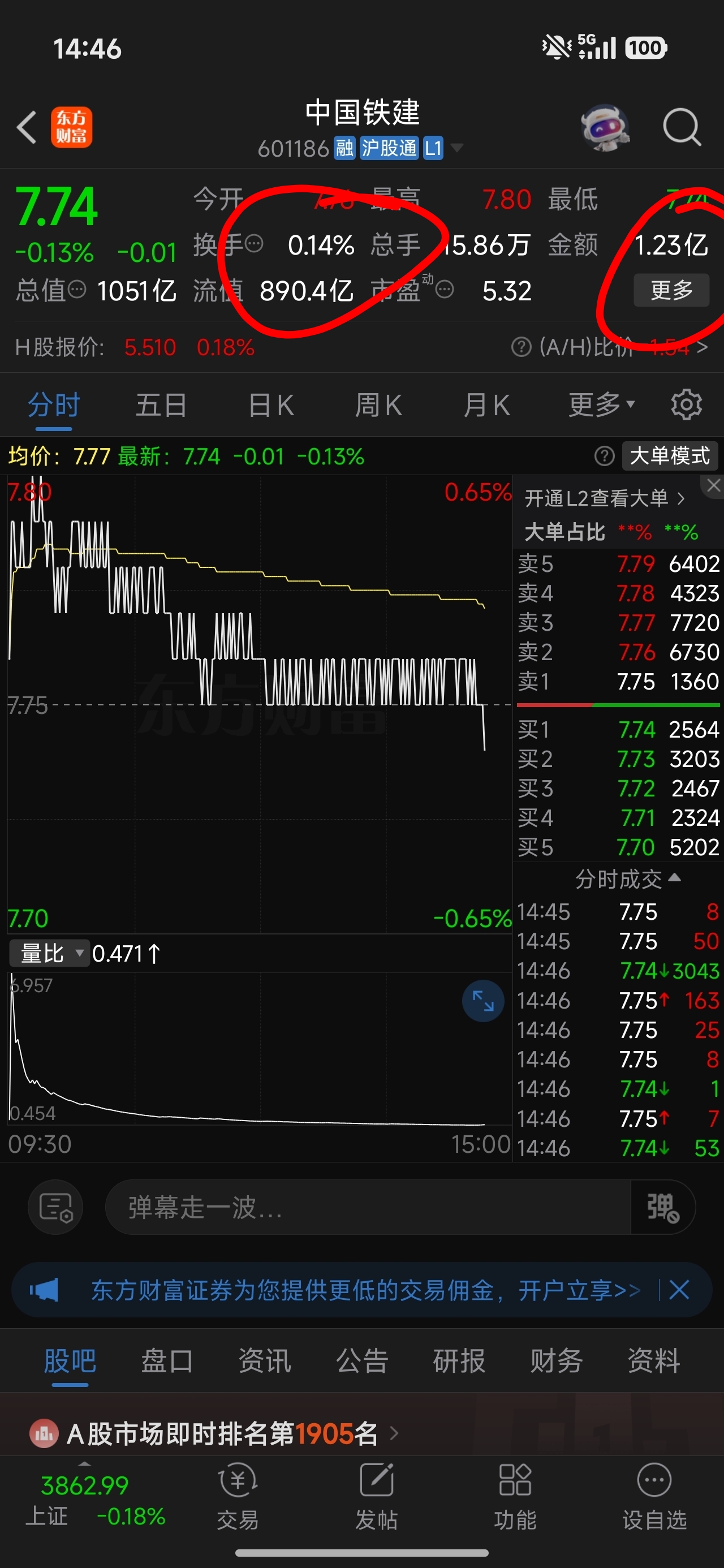 换手率新低,沦为僵尸股,1000亿盘子成交量1亿出头。