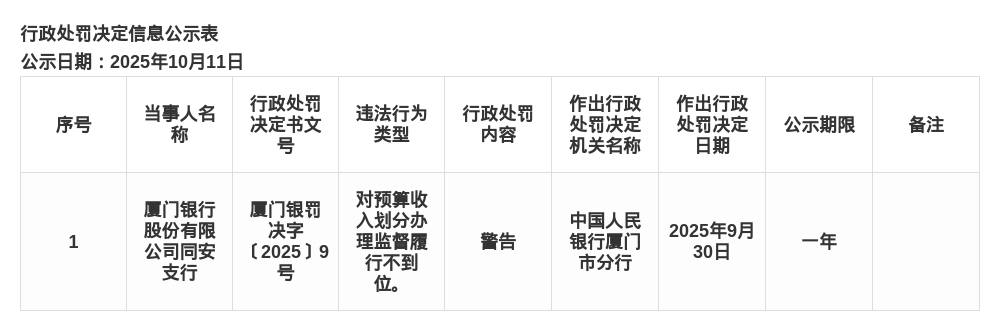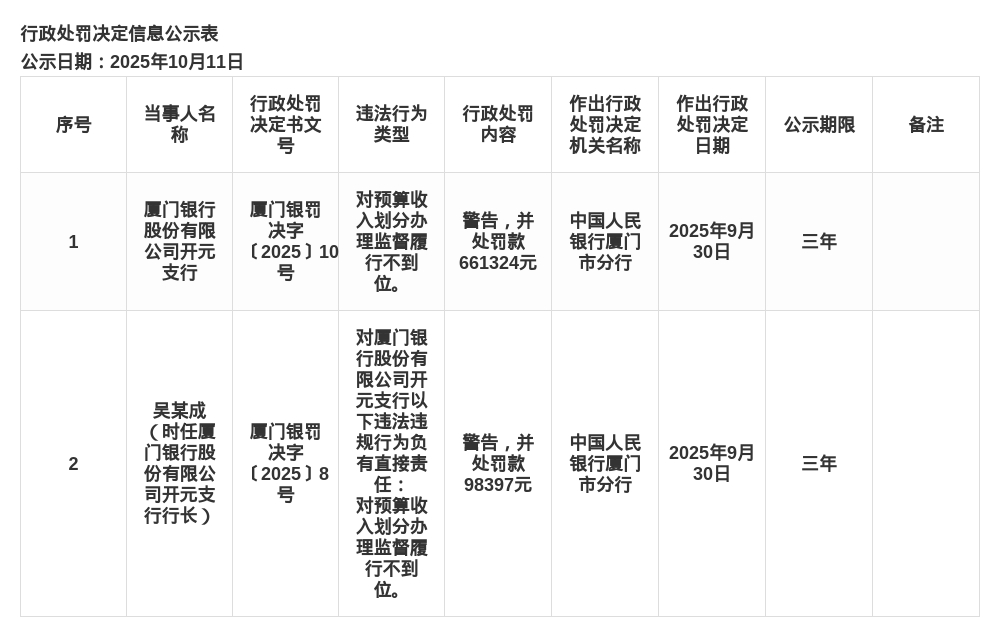 厦门银行开元支行被罚66.13万,同安支行被警告