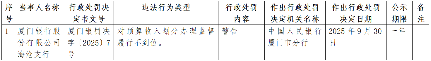 其中,厦门银行股份有限公司海沧支行因对预算收入划分办理监督履行不到位,被警告。