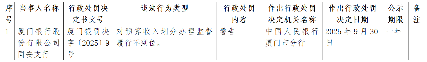 厦门银行股份有限公司同安支行因对预算收入划分办理监督履行不到位,被警告。