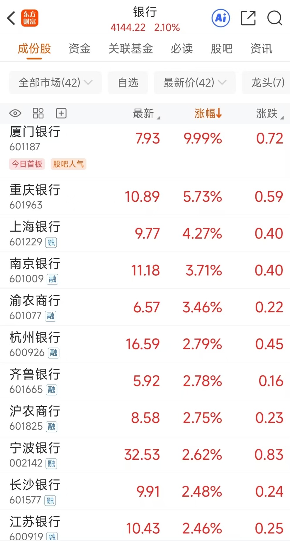 截至2月5日收盘,厦门银行封死涨停板,重庆银行涨幅达5.73%,上海银行上扬4.27%,南京银行上涨3.71%。A股银行板块的42只个股全部飘红,在31个申万一级行业中位居第二。