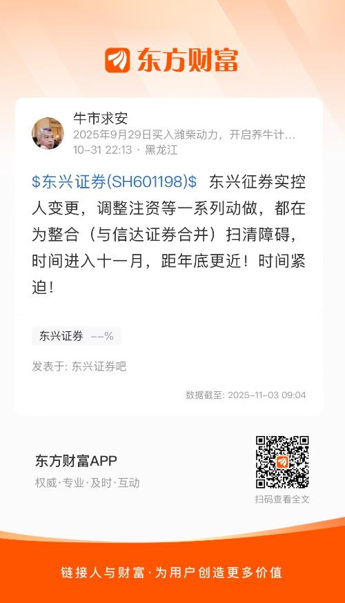 $东兴证券(SH601198)$ 东兴征券实控人变更,调整注资等一系列动做,都在为整合(与信达证券合并)扫清障碍,时间进入十一月,距年底更近!时间紧迫!