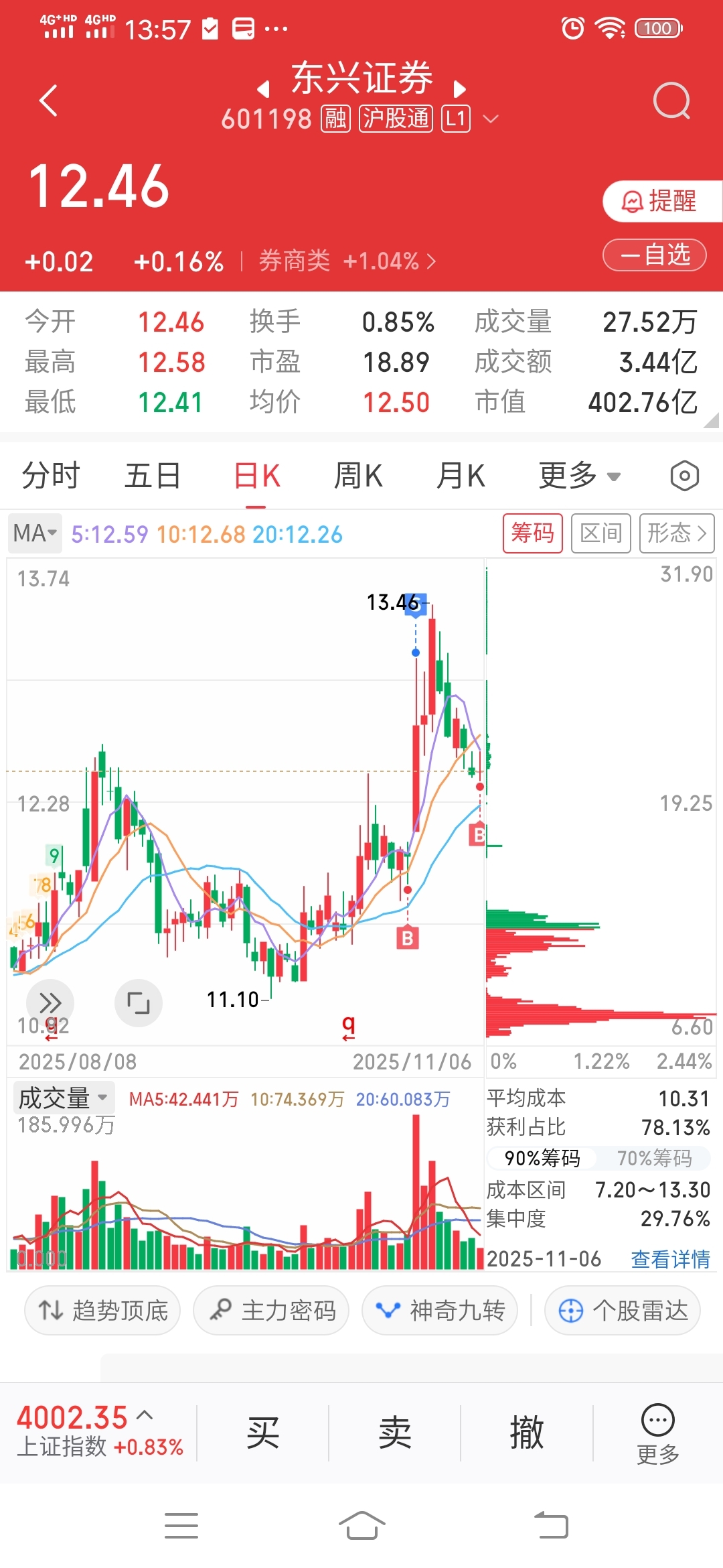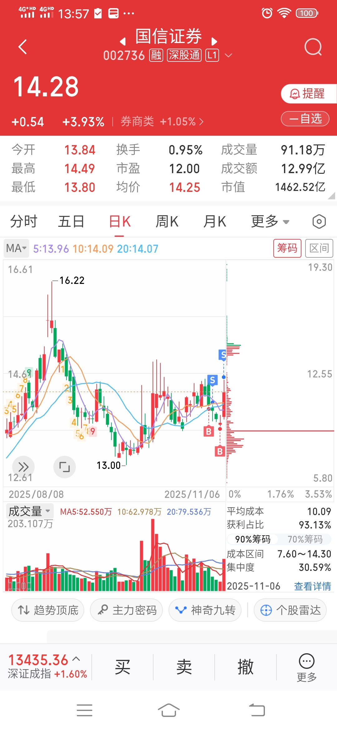 可以买了,我的软件提示买点了,12.43满仓了,昨天提示买点是国信,我昨天抄底今