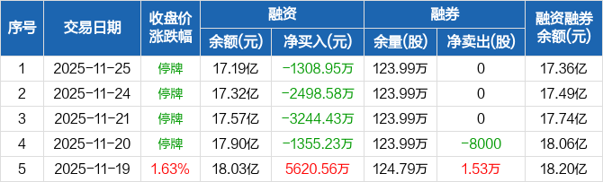 融资方面,当日融资买入0元,融资偿还1308.95万元,融资净偿还1308.95万元,连续4日净偿还累计8407.19万元。融券方面,融券卖出0股,融券偿还0股,融券余量123.99万股,融券余额1627.99万元。融资融券余额合计17.36亿元。