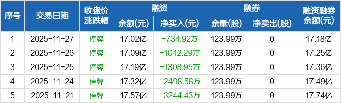 融资方面,当日融资买入0元,融资偿还734.92万元,融资净偿还734.92万元,连续6日净偿还累计1.02亿元。融券方面,融券卖出0股,融券偿还0股,融券余量123.99万股,融券余额1627.99万元。融资融券余额合计17.18亿元。