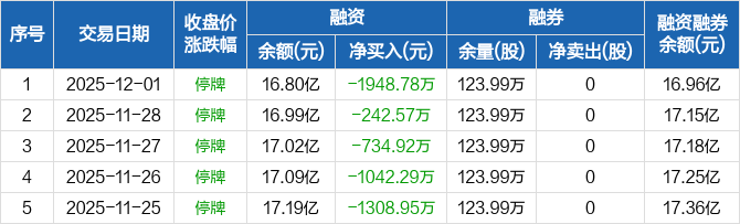 融资方面,当日融资买入0元,融资偿还1948.78万元,融资净偿还1948.78万元,连续8日净偿还累计1.24亿元。融券方面,融券卖出0股,融券偿还0股,融券余量123.99万股,融券余额1627.99万元。融资融券余额合计16.96亿元。