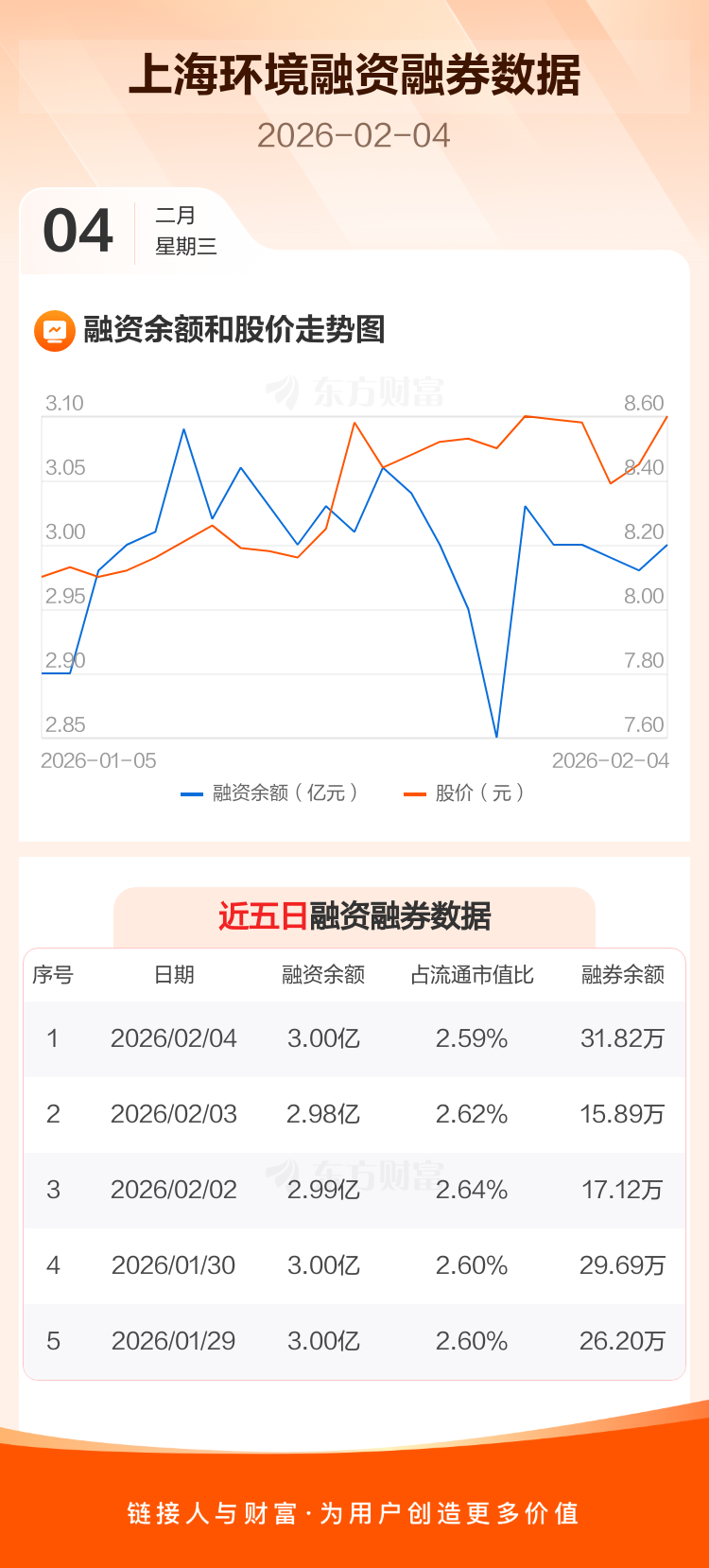 交易所最新数据显示,上海环境于2026年2月4日获融资买入1219.48万元,融资偿还1004.19万元,当日融资净买入215.29万元。目前,该股融资余额3.00亿,占流通市值比例为2.59%。
