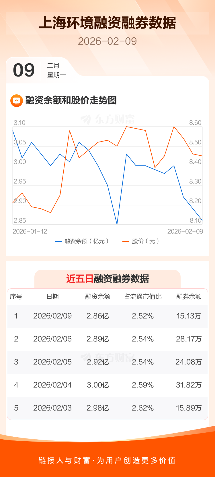交易所最新数据显示,上海环境于2026年2月9日获融资买入957.08万元,融资偿还1211.35万元,当日融资净偿还254.26万元。目前,该股融资余额2.86亿,占流通市值比例为2.52%。