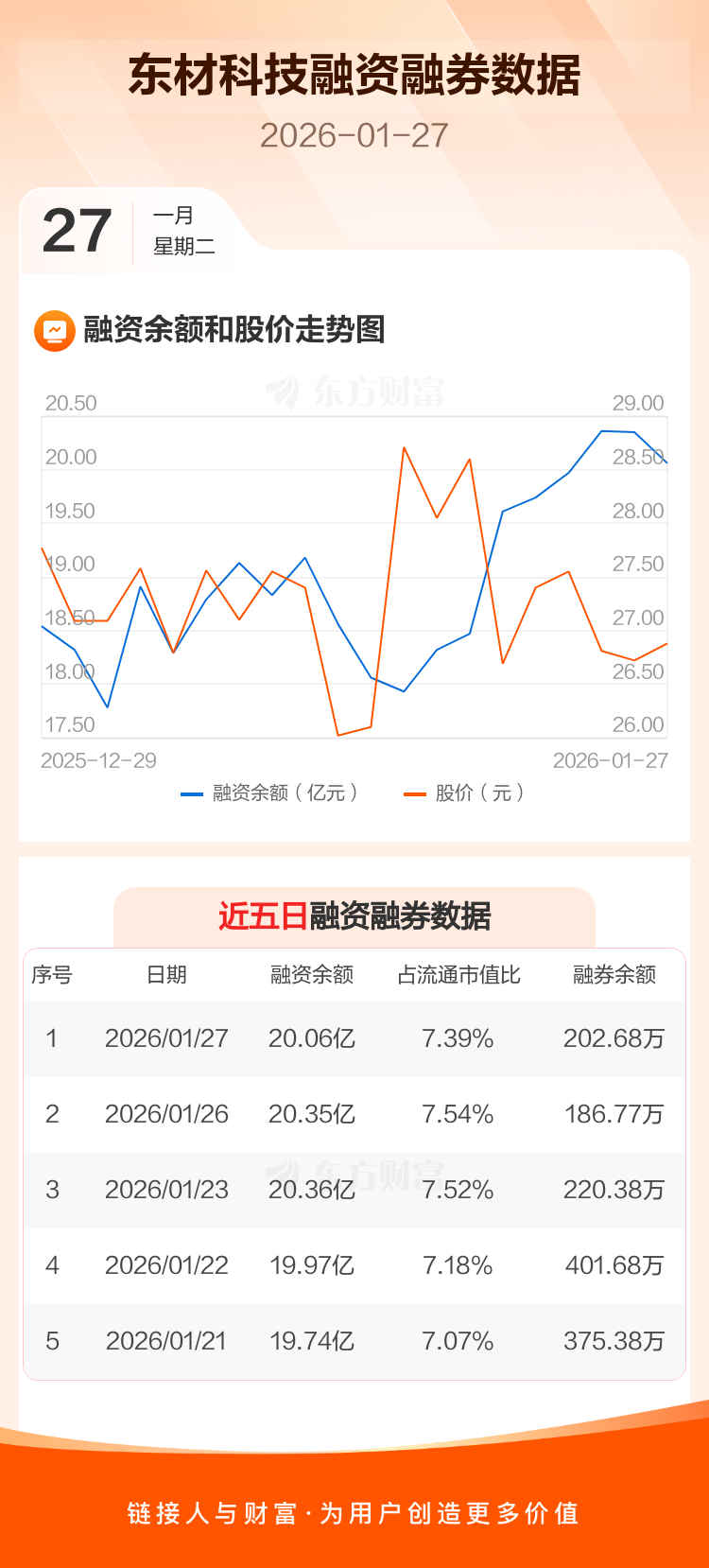 交易所最新数据显示,东材科技于2026年1月27日获融资买入1.24亿元,融资偿还1.53亿元,当日融资净偿还2920.46万元。目前,该股融资余额20.06亿,占流通市值比例为7.39%。