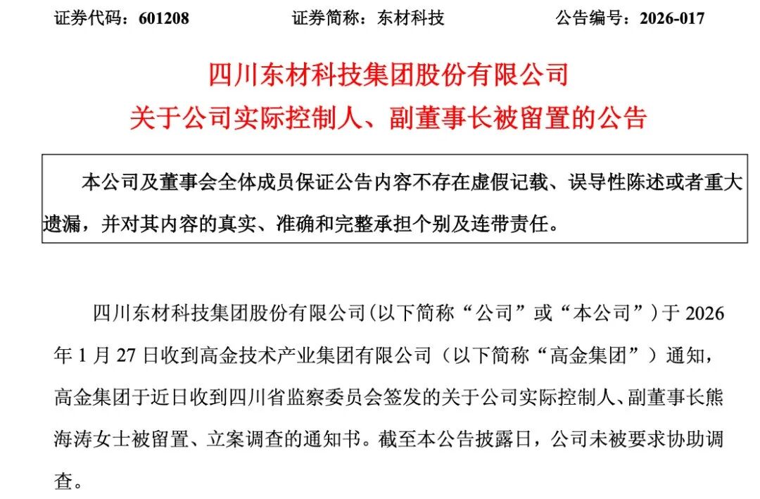东材科技称,公司于2026年1月27日收到高金技术产业集团有限公司(下称“高金集团”)通知,高金集团于近日收到四川省监察委员会签发的关于公司实际控制人、副董事长熊海涛被留置、立案调查的通知书。截至公告披露日,公司未被要求协助调查。