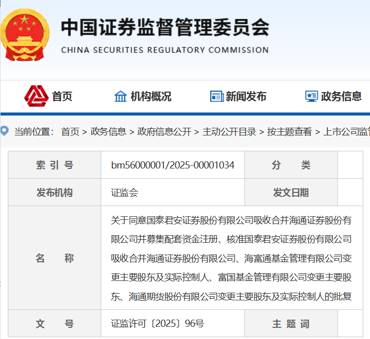证监会官网显示,中国证监会同意国泰君安证券以新增59.86亿股股份吸收合并海通证券,并核准国泰君安发行股份募集配套资金不超过100亿元。吸收合并完成后,海通证券依法解散,原海通证券分支机构变更为国泰君安分支机构。