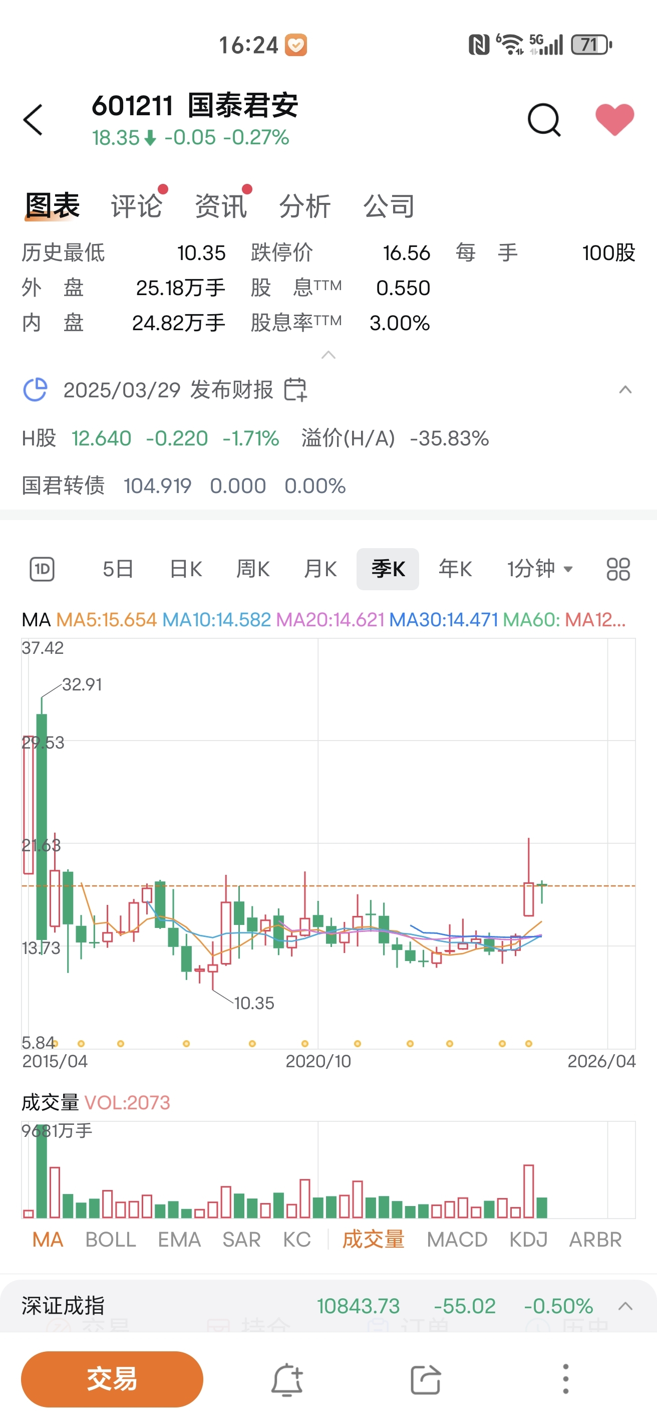 $国泰君安(SH601211)$ 都到这时候了,这成交量,如果你还没认识到这是个牛市,那你可以清仓离场了,牛市初中期就买券商,券商马上就要爆发,我就在里面潜伏着等着,反正在港股海通里翻了一倍了,现在等海通转换成国泰君安,国泰君安不到50不卖,我怕谁,横有多长,竖有多高,这轮券商航母必超万亿市值,这些你都看透了吗?哈哈哈,干吧,瘦巴巴的老爷们,你是我的兄弟啊!!!!