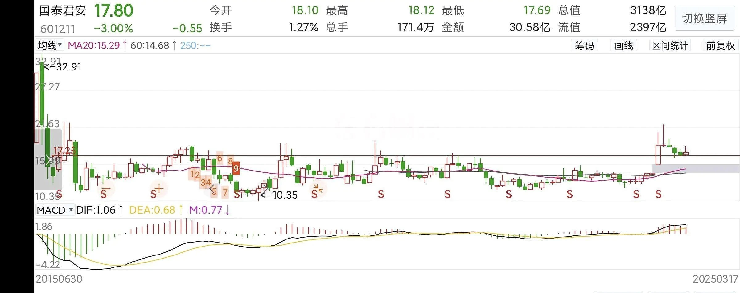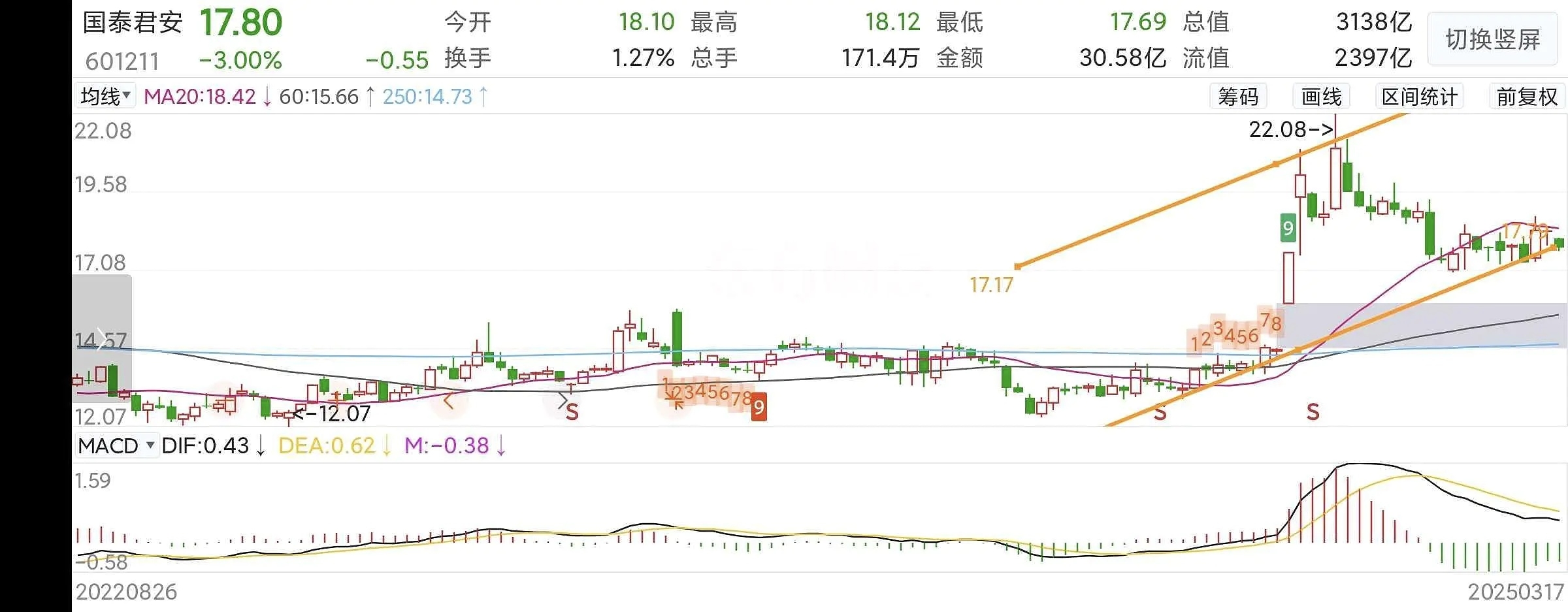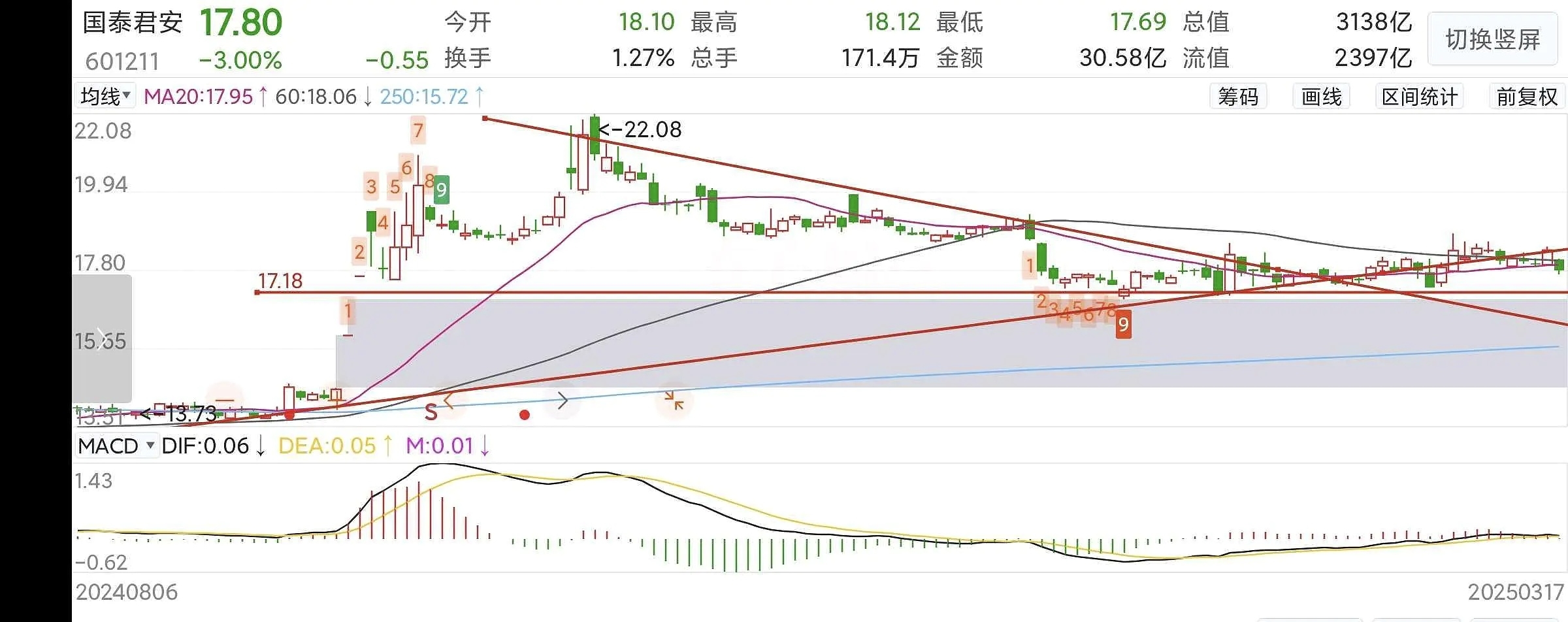 $国泰君安(SH601211)$ 调整有下限,日线低于17.19有钝化,周线碰到下通道,月线目前已经调整到10年来的横盘区域上限,不可能再进入这个区间,总体的调整底线大概也就在17.2左右,上涨起来上限又很高,并且大盘感觉最近蠢蠢欲动,而券商又是领头羊,先拿住吧。