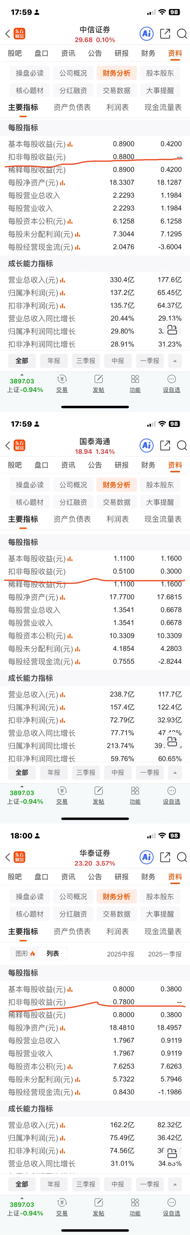 和中信和华泰比,扣非业绩不如人家,决定了股价不如人家。如果对比中信,华泰倒还有一