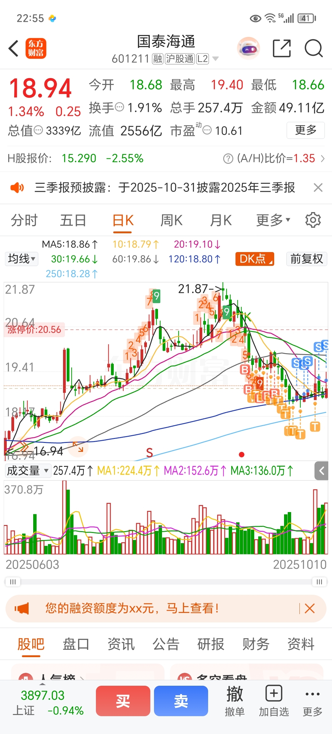 $国泰海通(SH601211)$ 9月2日早盘竞价涨停建仓,20.65买入900股,是作的开始。目前我做到了19开头,虽然仓位重了。加油吧,被套的朋友!
