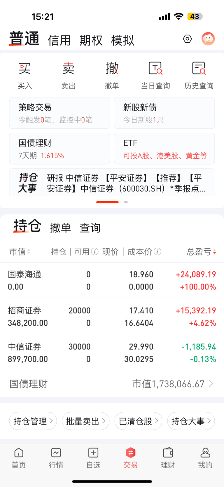 !卖掉第一原因是分红扣税!第二原因是国泰今天的涨幅比中信大一点!可以换一下股票不吃亏。今天依然持有招商证券2万股!没卖。目前半仓操作思路,剩下170万卖了国债逆回购!如果明天中信涨!我就切换回国泰继续持有!