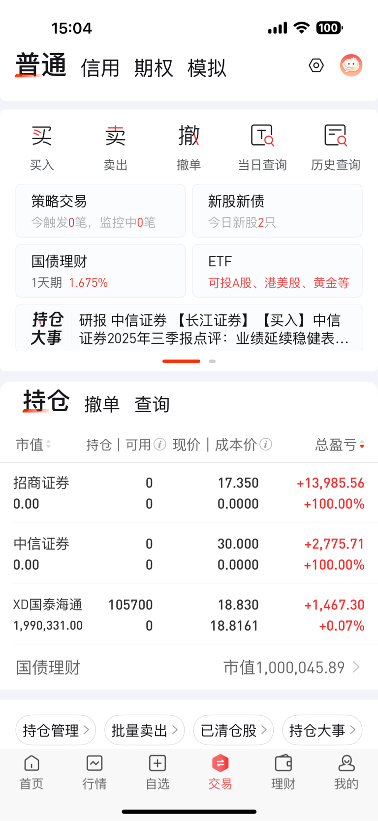 $XD国泰海(SH601211)$ 早盘又买回了6万股国泰!18.81元。下午收盘前!又买入4万股!18.82元,剩下零钱全部买入。我胡汉三又回来了