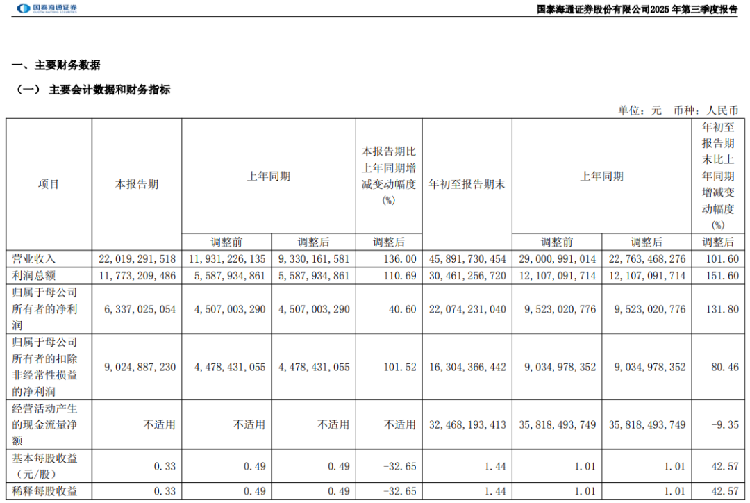 报告显示,今年第三季度,国泰海通单季实现营业收入220.2亿元,同比增长136.0%;扣非归母净利润90.2亿元,创历史新高,同比增长102%,环比第二季度增长126%。