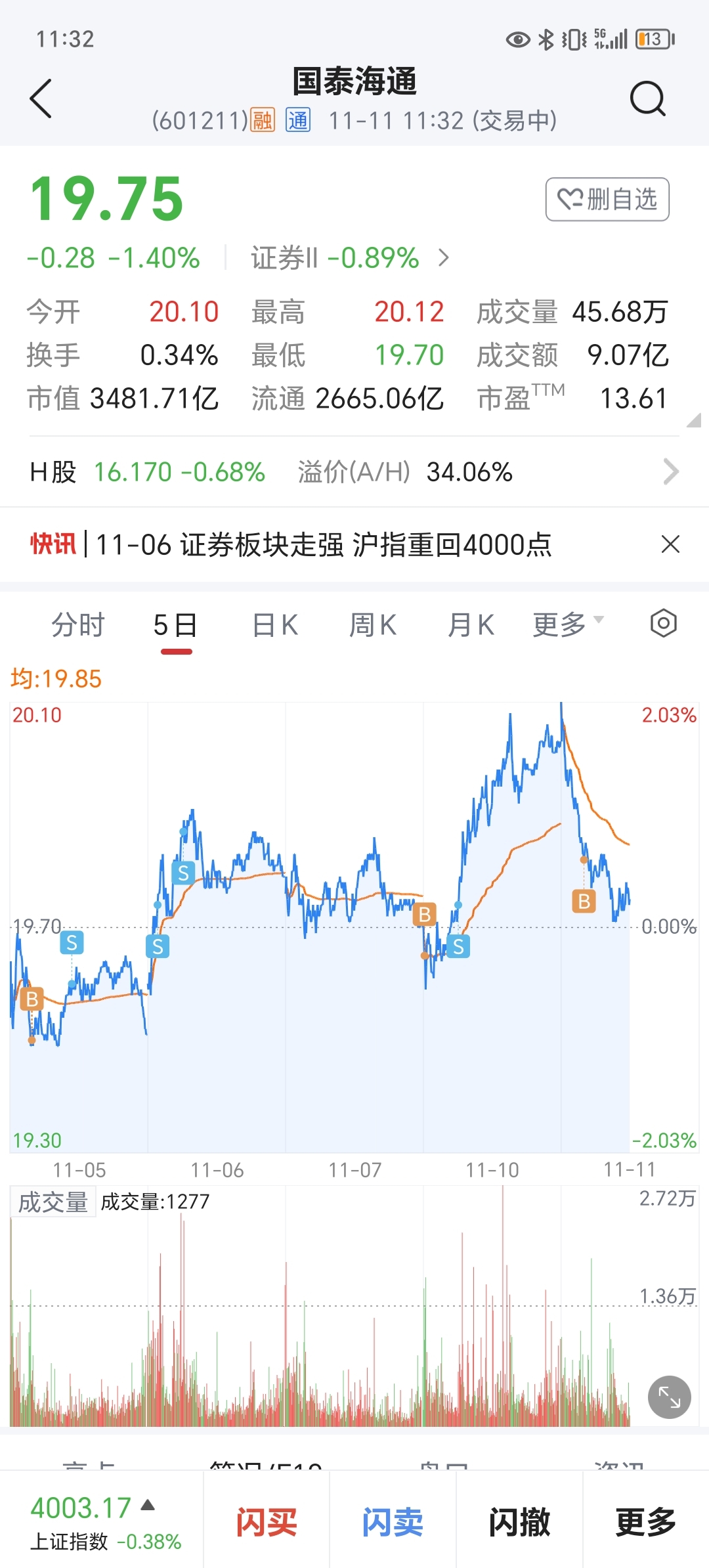 $国泰海通(SH601211)$ 我喜欢下跌趋势买入,不喜欢上涨,我都卖飞了