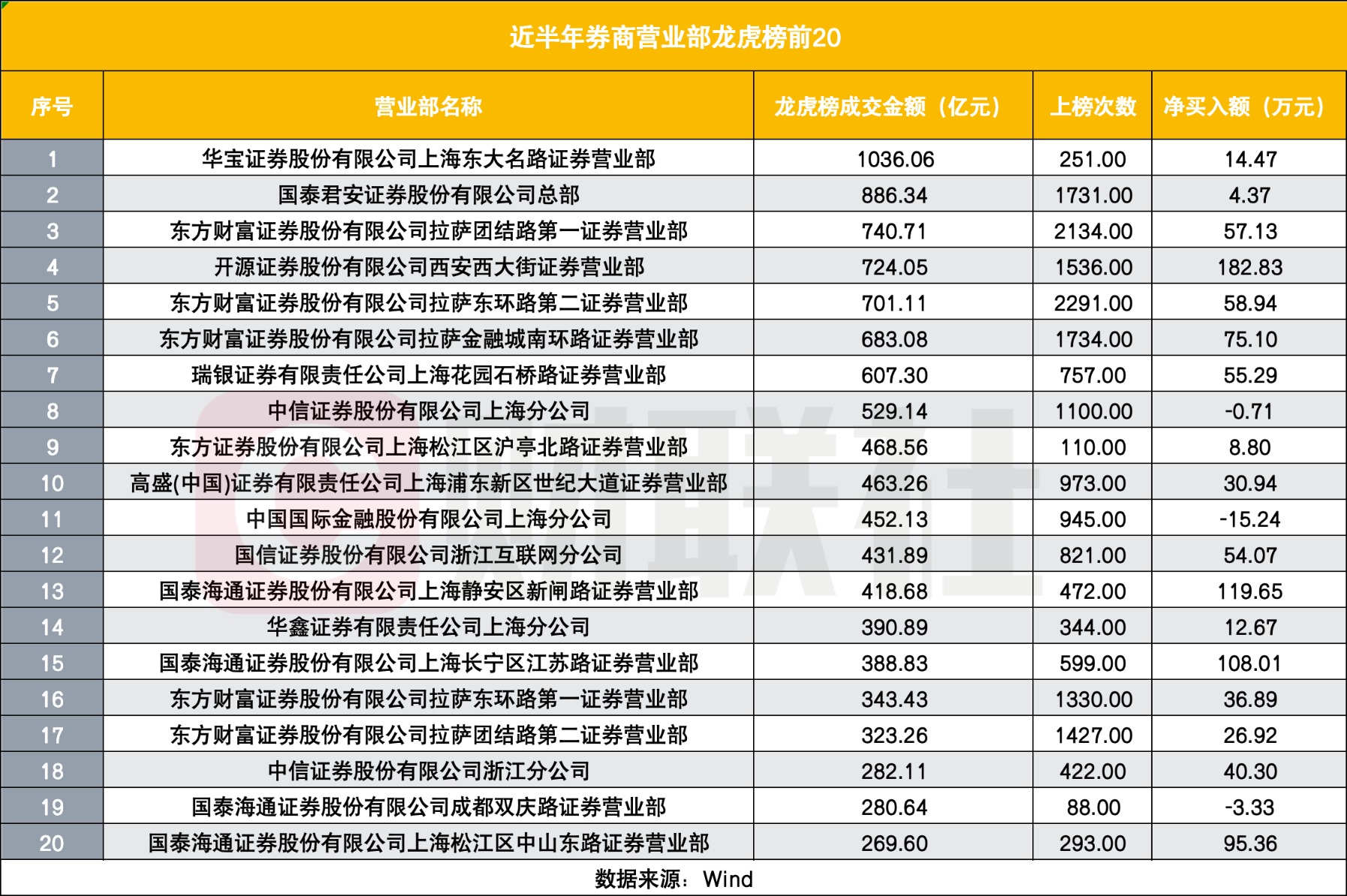 三是机构主导趋势逐渐加强,国泰君安证券总部稳居各类榜单前列,近半年以1731次上榜次数遥遥领先,背后是公募基金、保险资金等大机构的持续调仓;华宝证券上海东大名路营业部以1036.06亿元成交金额位居半年榜首位,凸显机构化交易硬核实力。