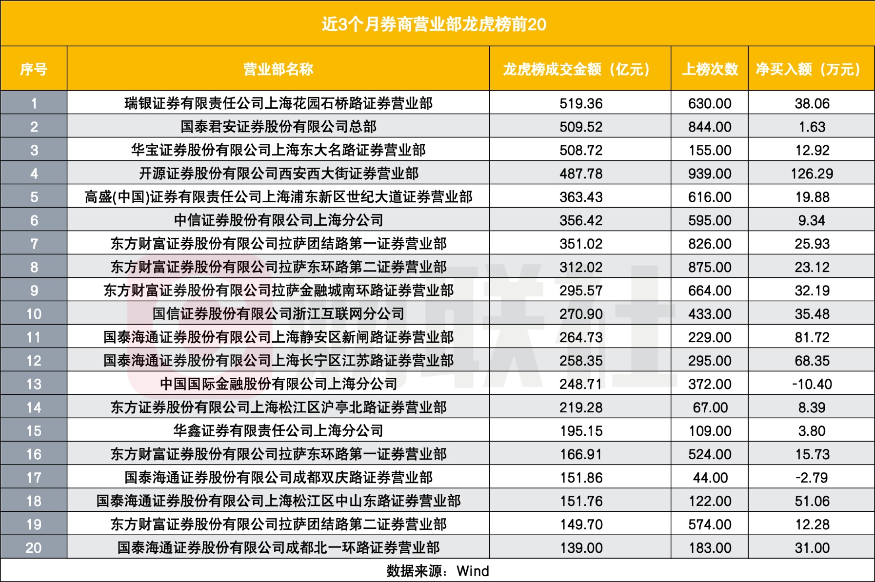 中期维度下,瑞银证券上海花园石桥路营业部位列3个月榜首位,凸显了外资在近3个月对A股的持续加仓。国泰君安总部、华宝证券上海东大名路紧随其后,成交金额均突破500亿元。开源证券西安西大街营业部依旧位列第四。