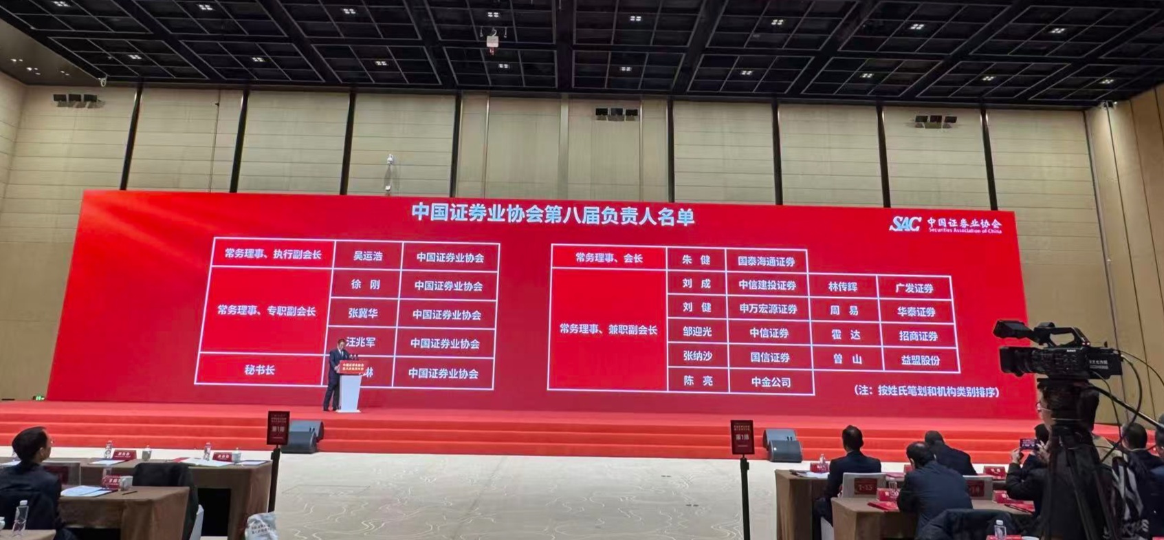 国泰海通证券董事长朱健当选中国证券业协会第八届理事会会长职务,另外还有九位行业人士当选协会常务理事、兼职副会长,分别是:中信建投证券刘成、广发证券林传辉、申万宏源证券刘健、华泰证券周易、中信证券邹迎光、招商证券霍达、国信证券张纳沙、益盟股份曾山和来自中金公司的陈亮。