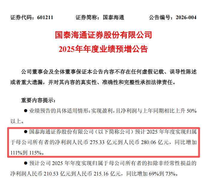 1月27日,国泰海通公告称,预计2025年归属上市公司股东的净利润为275.33亿元至280.06亿元,同比增加111%至115%。