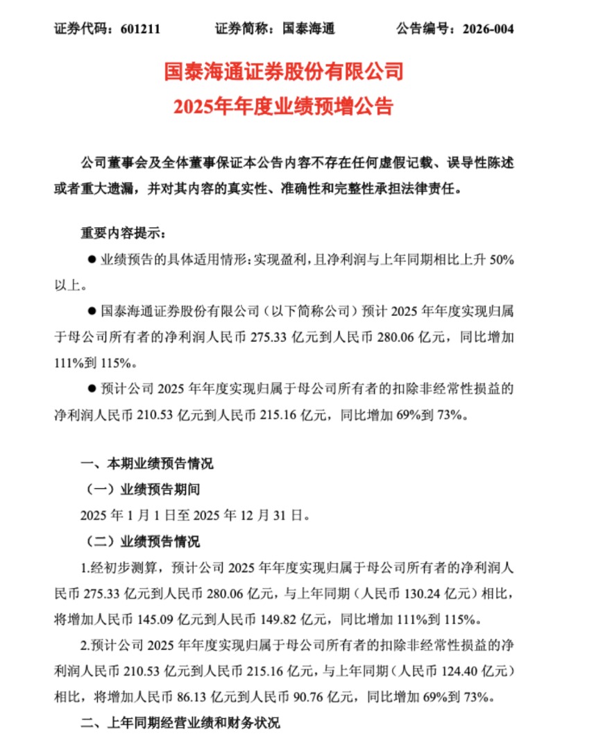 央广网北京1月28日消息1月27日晚间,国泰海通发布2025年年度业绩预增公告。2025年度,预计该公司实现归母净利润275.33亿元到280.06亿元,同比增加111%到115%;实现扣非归母净利润210.53亿元到215.16亿元,同比增加69%到73%。