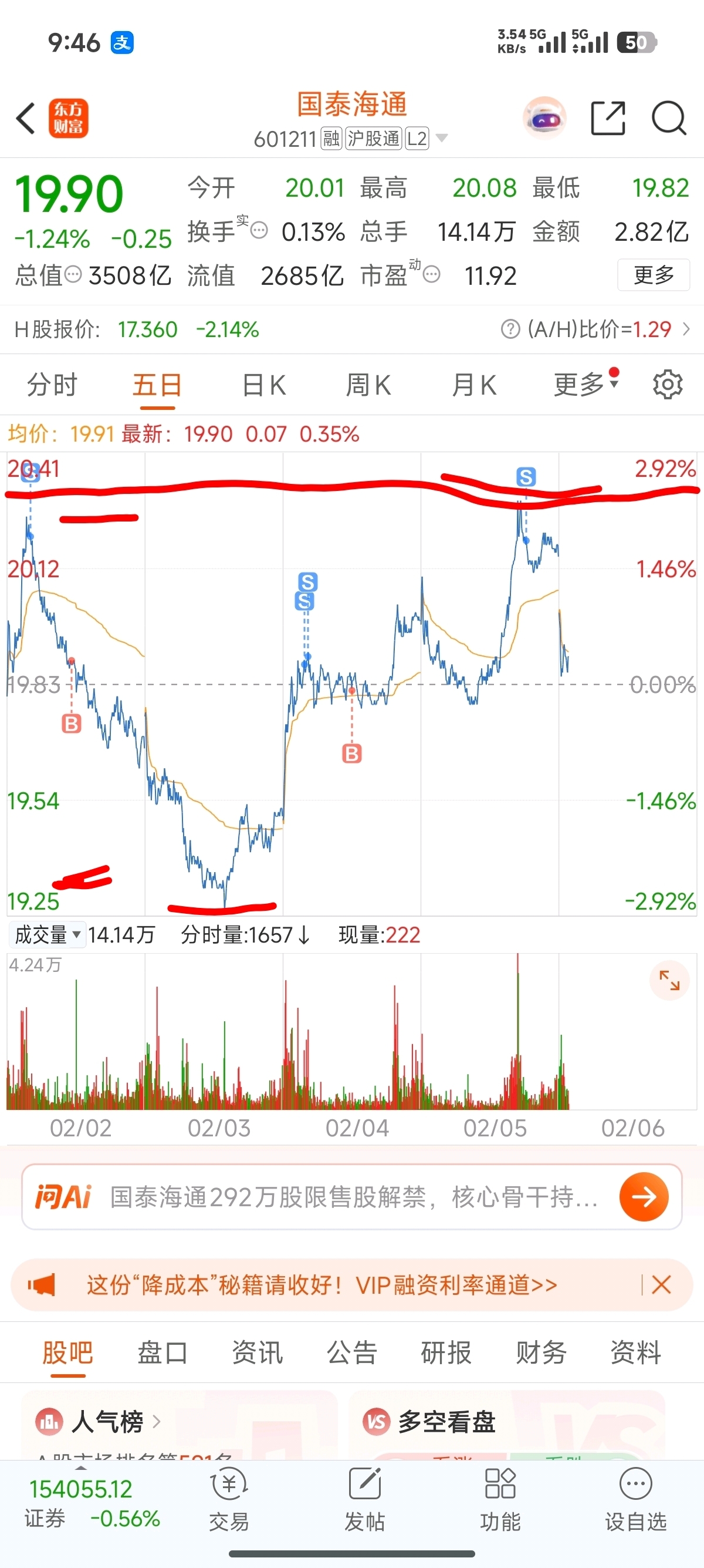 $国泰海通(SH601211)$ 有时候看五日图形,其实比看指标管用,这周二跟上周五都是同样一个基本平行底,同样周一跟昨天基本也是平行顶,所以说会不会历史重演向上周五看齐?