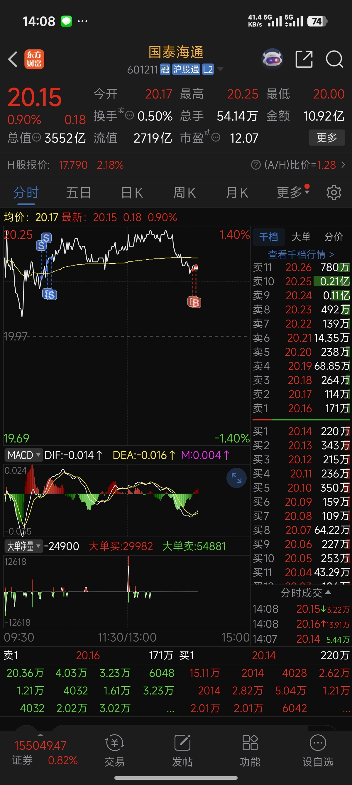 $国泰海通(SH601211)$ 今天做t失败了,仓数不变,亏了点手续费,白玩了一天,希望尾盘别掉