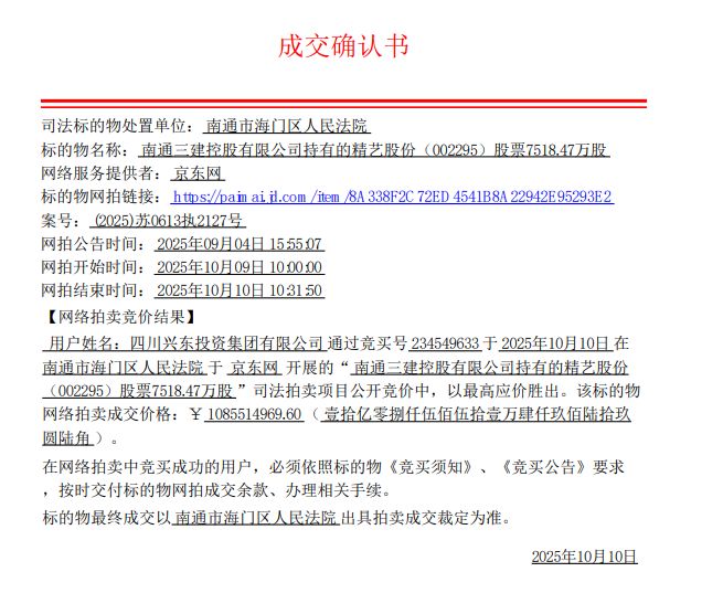 精艺股份10月10日(周五)晚间公告称,公司控股股东南通三建控股有限公司(下称三建控股)所持有的7518.47万股公司股份(占公司总股本的29.99996%)网拍阶段已经结束,四川兴东投资集团有限公司(下称四川兴东)以约10.86亿元的总价款竞得。