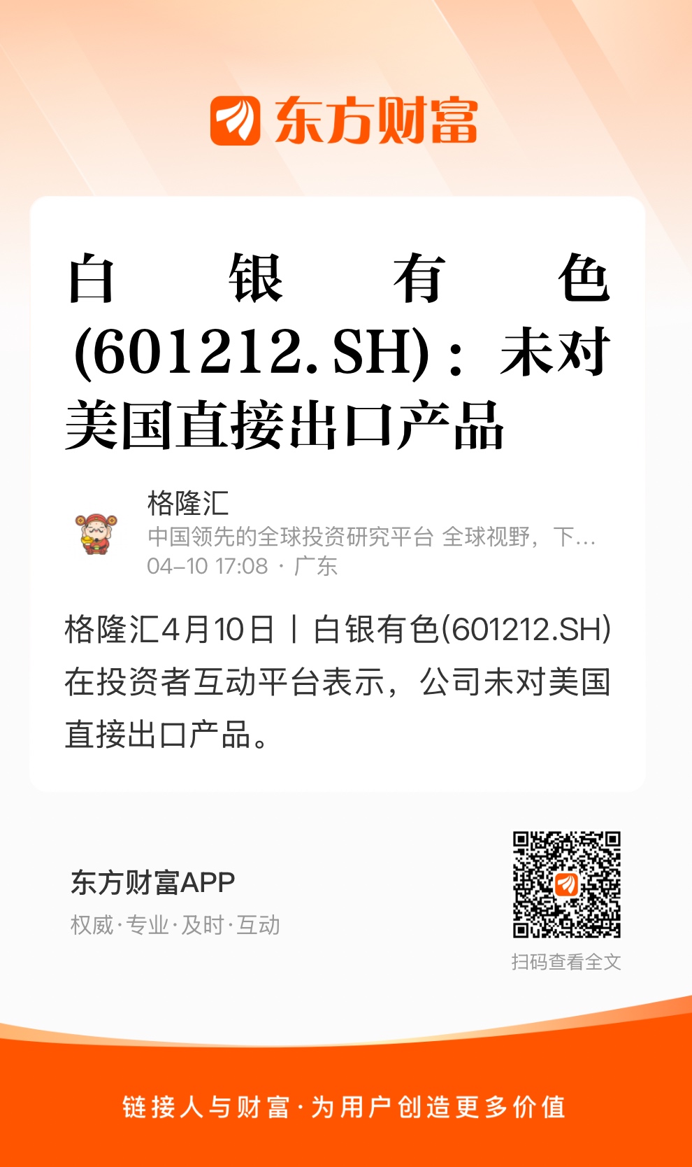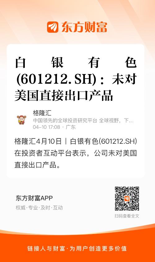 格隆汇4月10日丨白银有色(601212.SH)在投资者互动平台表示,公司未对美国直接出口产品。