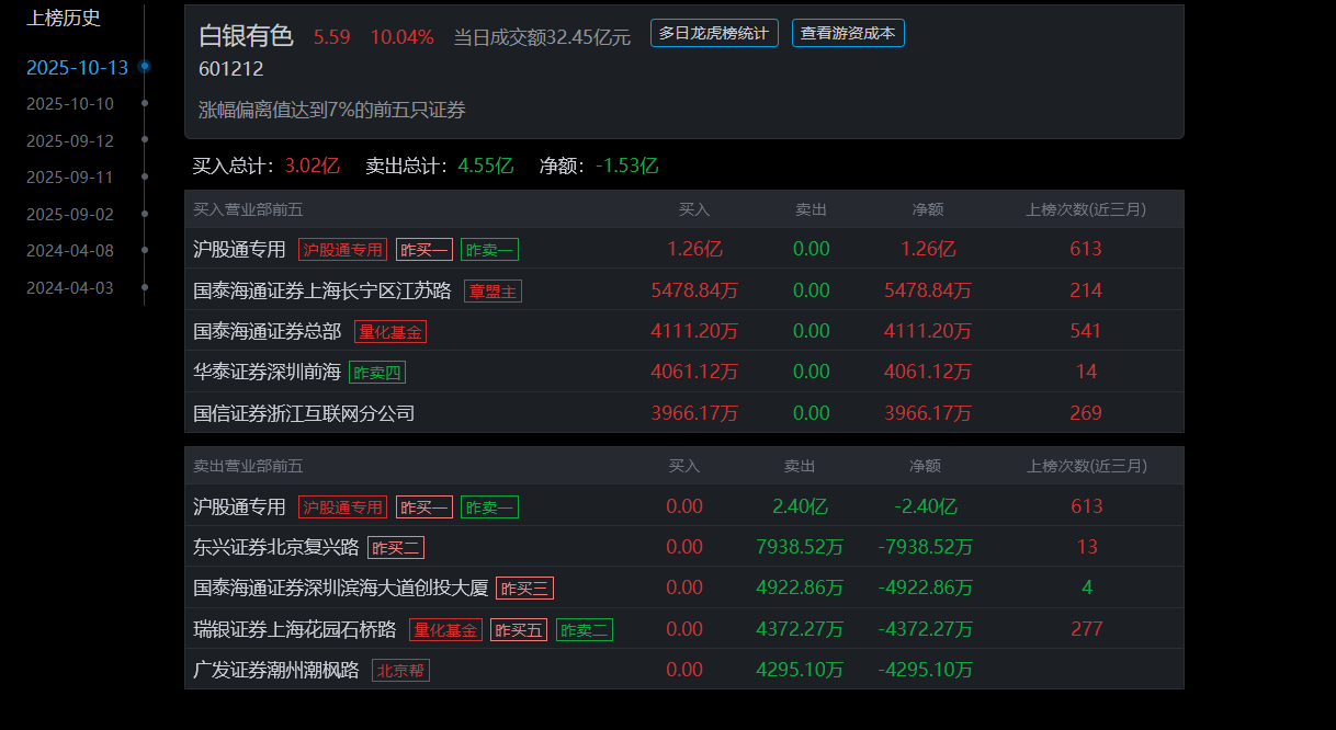 白银有色今日游资龙虎榜席位上榜数据如下!