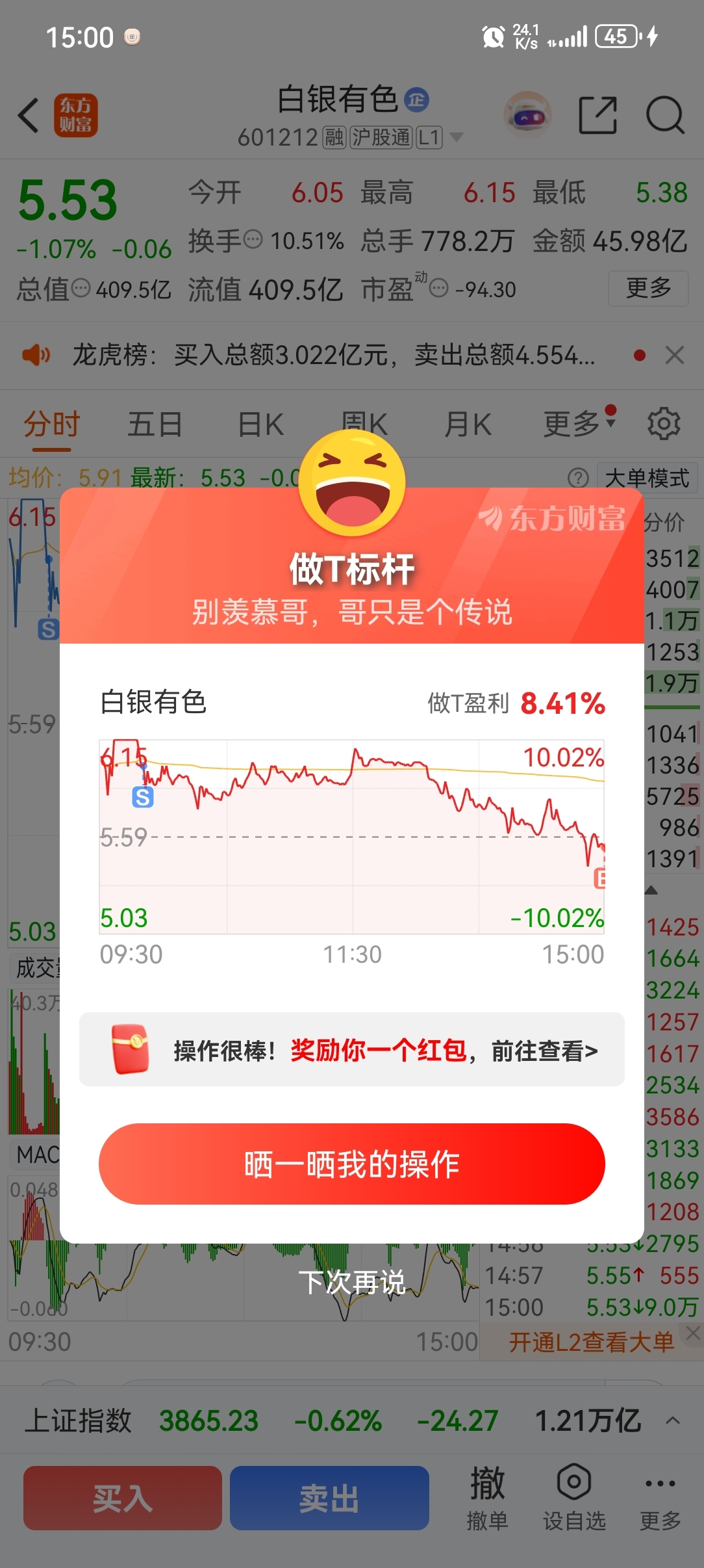 $白银有色(SH601212)$ 关注两天前面都是涨停板,昨天买了今早就出了,下午跌就买回来。