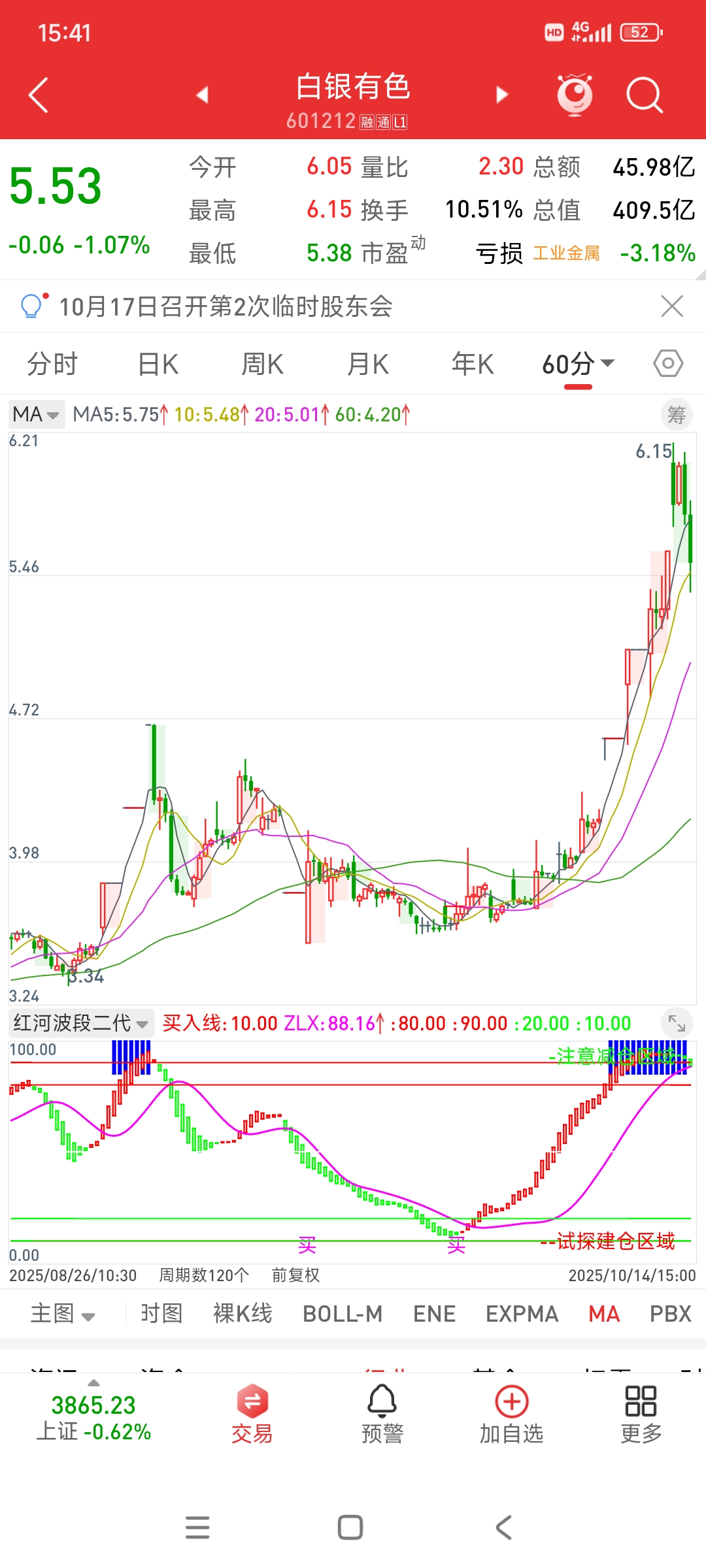 $白银有色(SH601212)$ 蓝柱代表超买,60分钟级别底部跳买以后再加上绿柱转红柱,一路上行到今天,终于在顶部出现了红柱转绿柱,说明短线资金已经撤退,短线对应小级别,如果是短线党就注意风险吧。