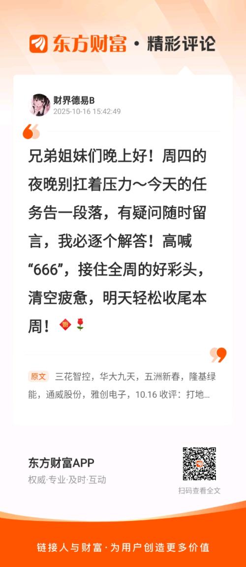 //@财界德易B :兄弟姐妹们晚上好!周四的夜晚别扛着压力~今天的任务告一段落,有疑问随时留言,我必逐个解答!高喊 “666”,接住全周的好彩头,清空疲惫,明天轻松收尾本周!$白银有色(SH601212)$$中兴通讯(SZ000063)$$四方股份(SH601126)$